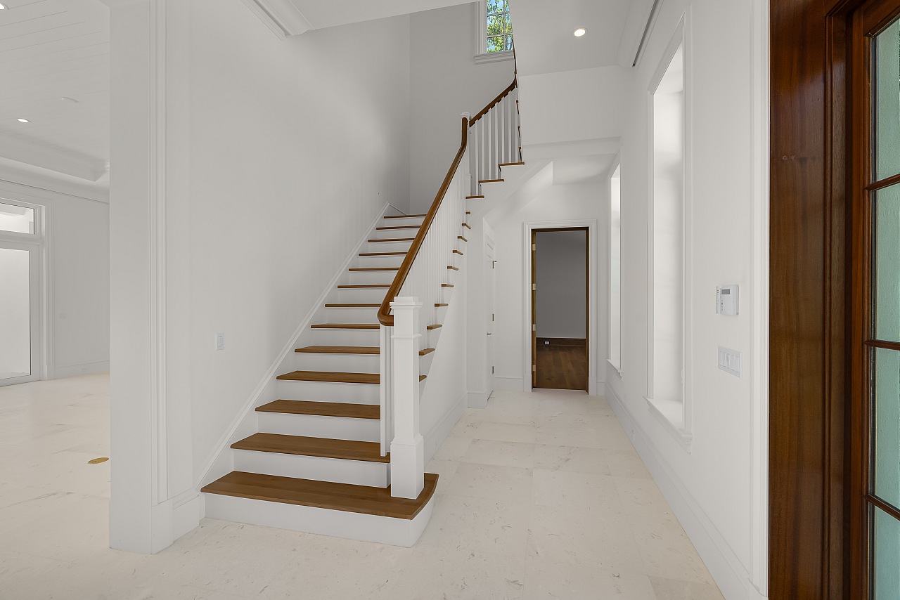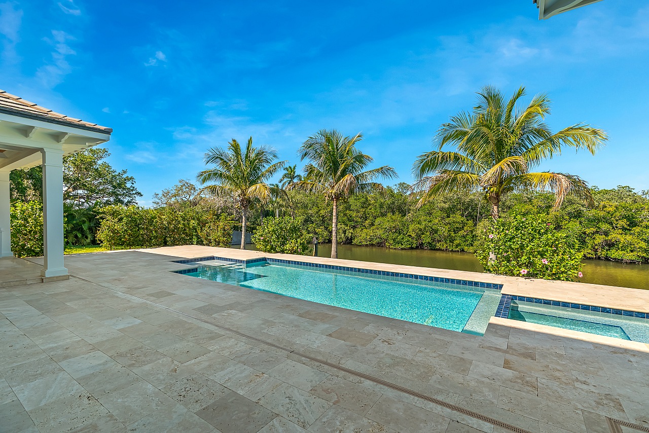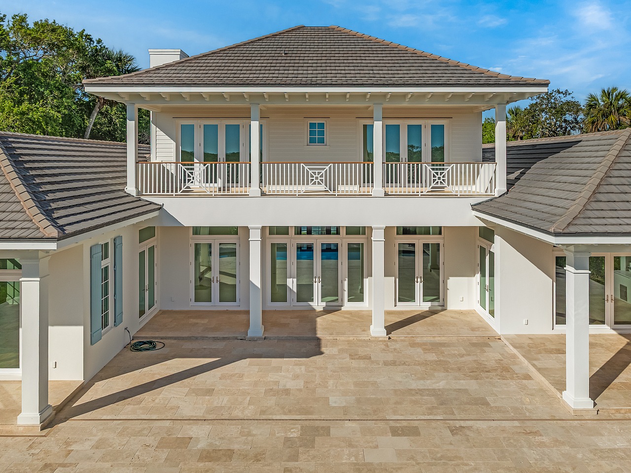 Encompassing 7,773 total square feet, this custom residence—designed by Gregory Anderson and built by Water’s Edge Estates—blends architectural drama with serene coastal living. Highlights include intricate ceiling details, a three-bay garage, a resort-style pool and spa, guest balconies, a covered lanai, and a fully equipped outdoor kitchen.