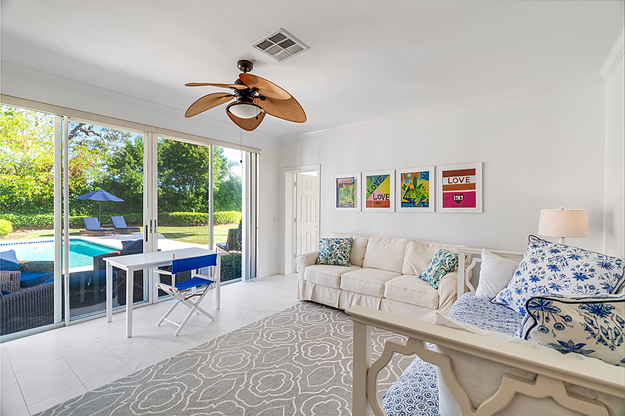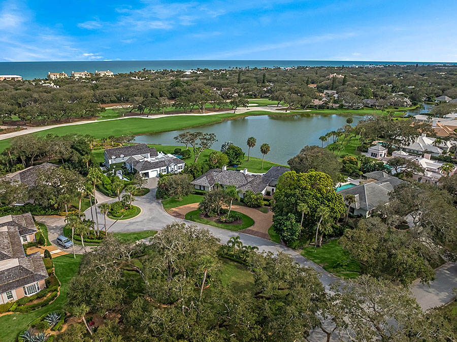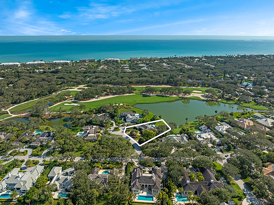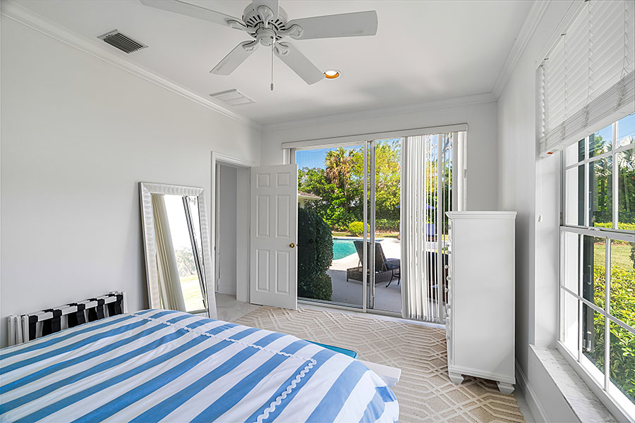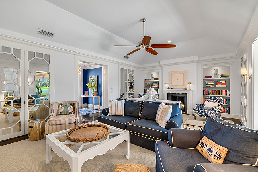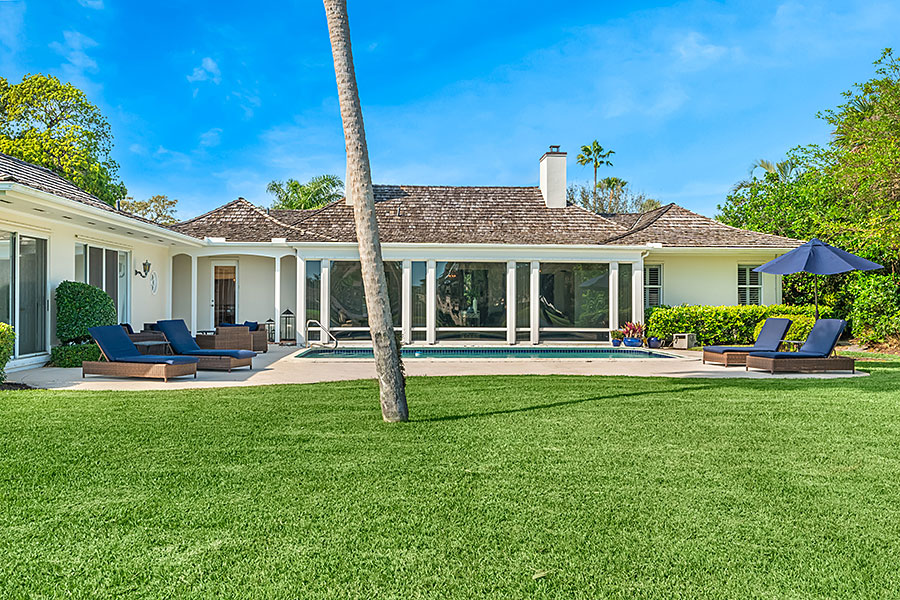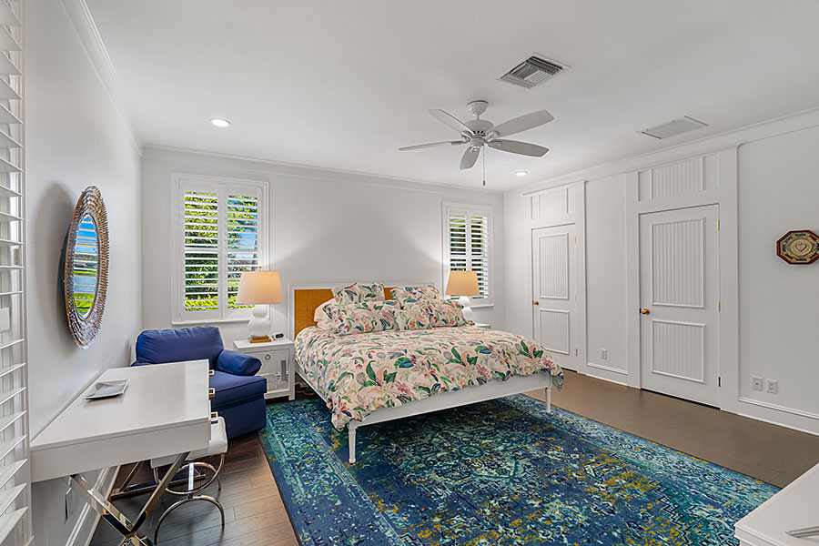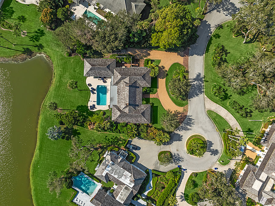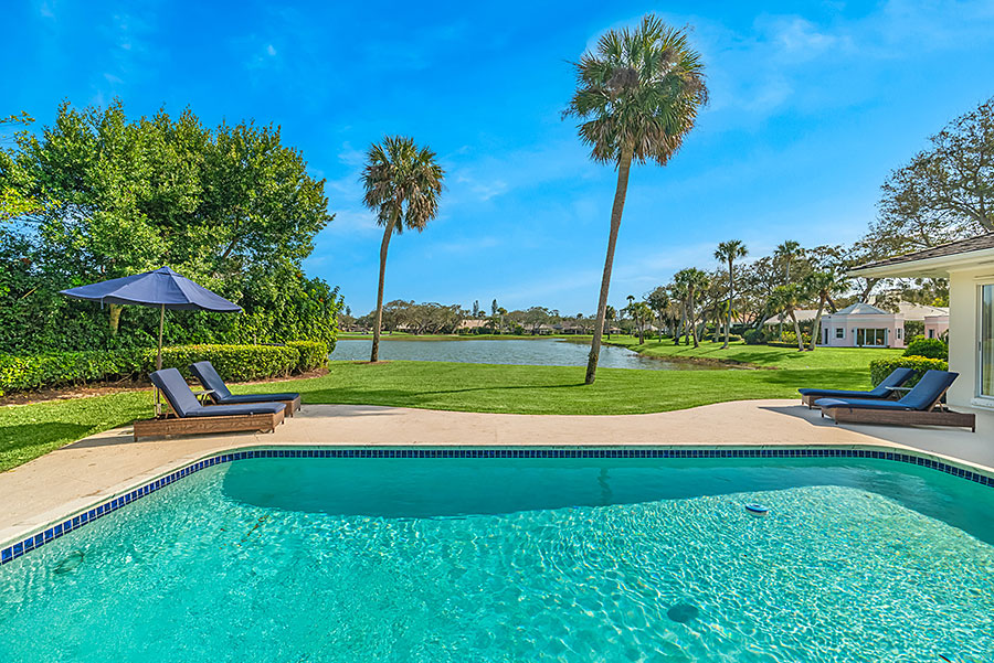 Tucked at the end of a quiet cul-de-sac, this 3BR + office main residence with a 2-room guest cabana offers serene south-facing lake and golf views. A spacious living room with fireplace and tray ceilings flows into an enclosed lanai, ideal for year-round enjoyment. The open kitchen is perfect for entertaining with a wet bar, premium appliances, and generous storage. Custom millwork and hardwood floors add timeless character. Outside, a private pool and lush gardens create an inviting retreat for relaxing or hosting under the stars.