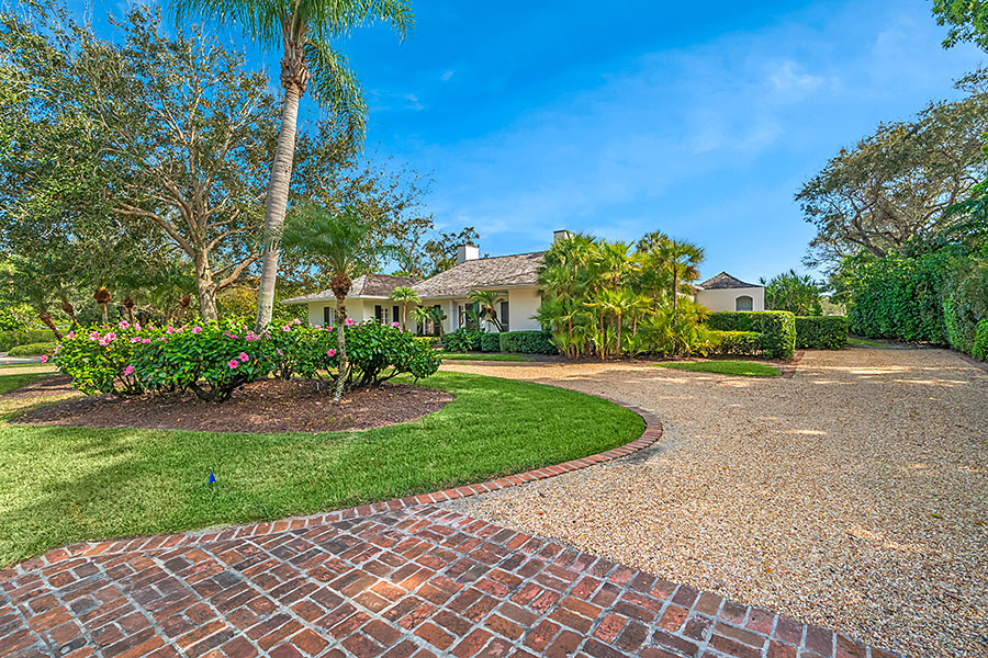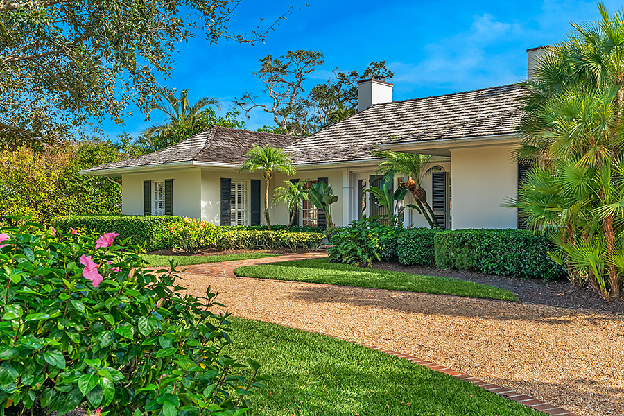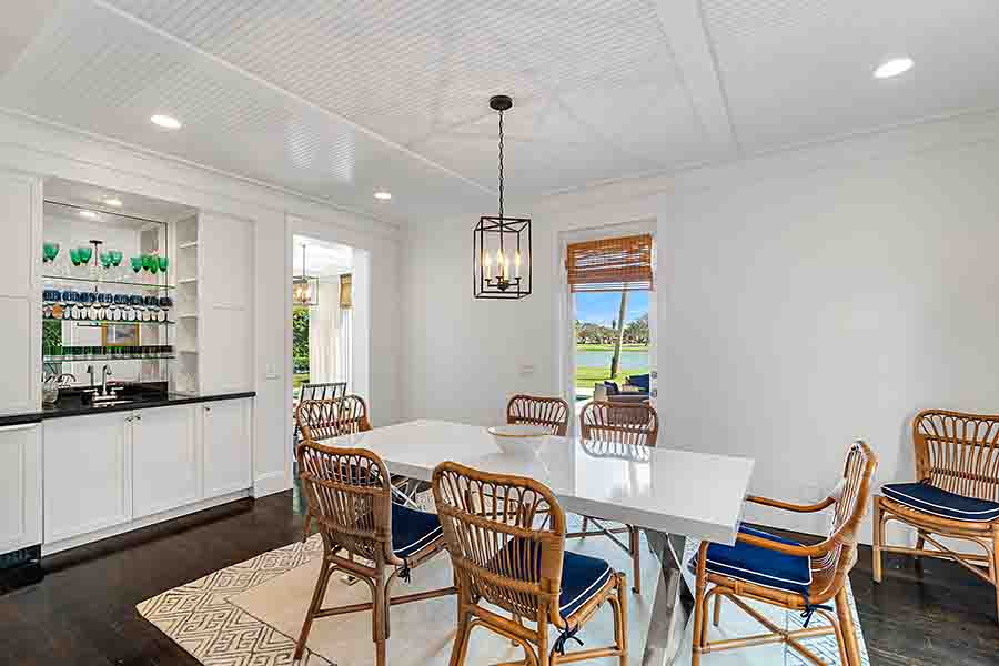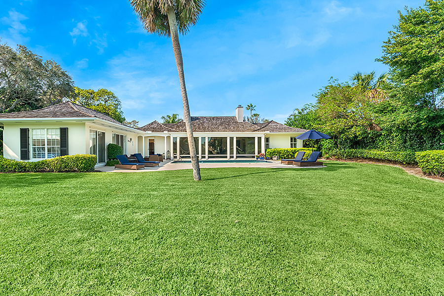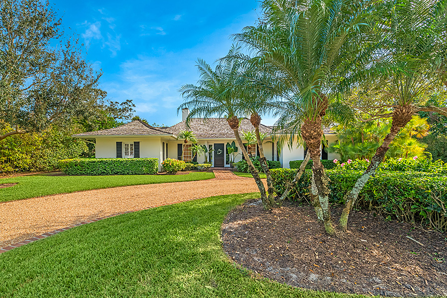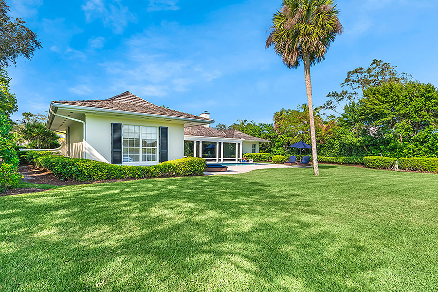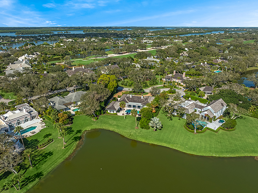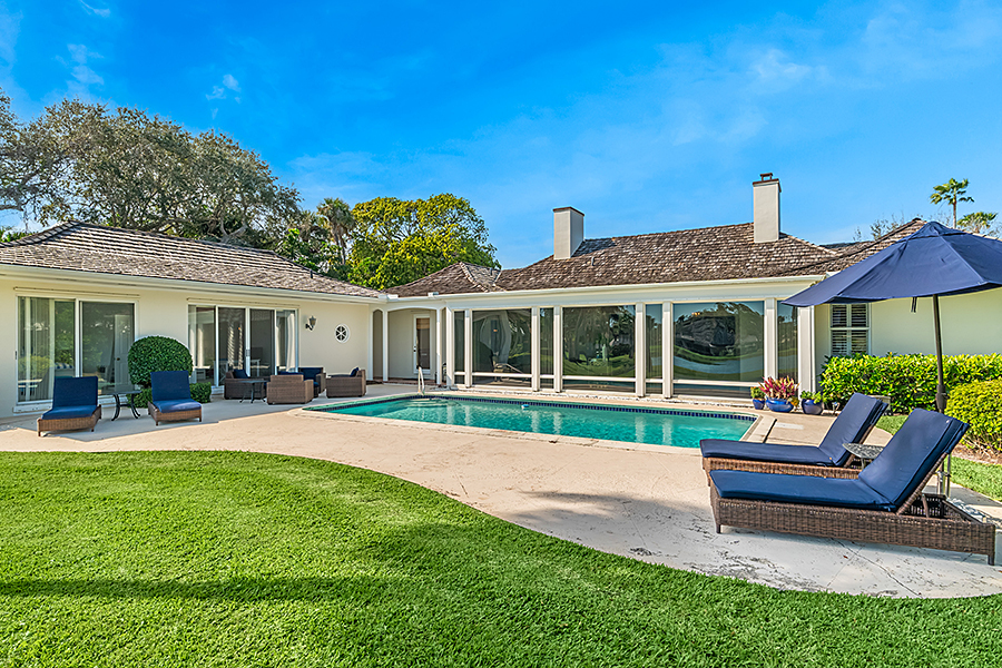 Tucked at the end of a quiet cul-de-sac, this 3BR + office main residence with a 2-room guest cabana offers serene south-facing lake and golf views. A spacious living room with fireplace and tray ceilings flows into an enclosed lanai, ideal for year-round enjoyment. The open kitchen is perfect for entertaining with a wet bar, premium appliances, and generous storage. Custom millwork and hardwood floors add timeless character. Outside, a private pool and lush gardens create an inviting retreat for relaxing or hosting under the stars.
