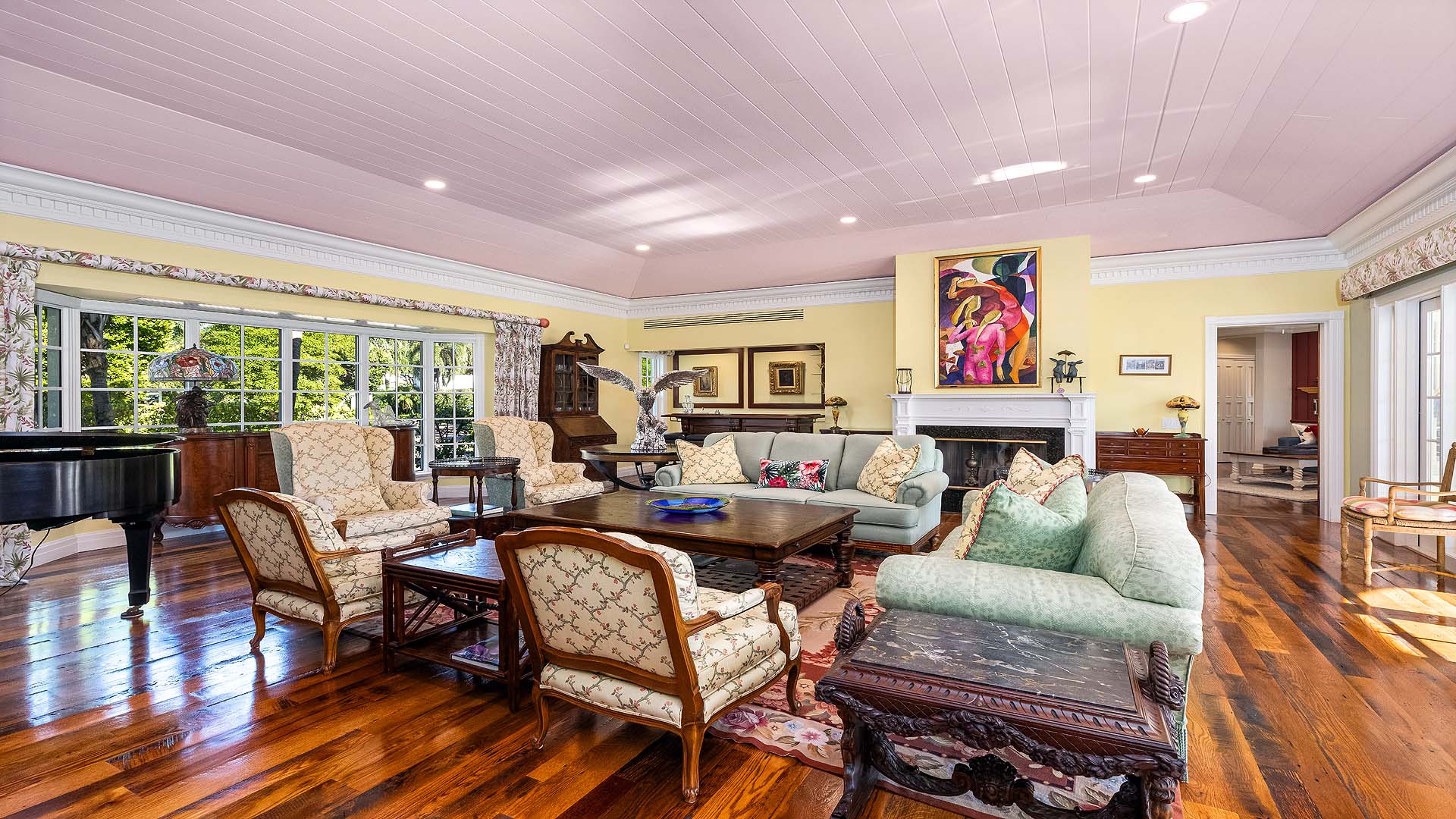 A gracious foyer sets the tone for the home's inviting elegance, leading to an expansive living room that overlooks the pool, gardens, and waterway beyond. The wood-paneled library/den provides a warm and distinguished setting for work or relaxation, while the formal dining room captures garden views and overlooks the covered loggia, perfect for gatherings and alfresco entertaining. The renovated kitchen is a showpiece - spacious and welcoming with vaulted wood-beamed ceilings, custom cabinetry, fine finishes, and a full suite of premium appliances. Adjacent family and breakfast areas blend comfort and functionality, ideal for casual living. Upstairs, the primary suite commands sweeping views of the pool, grounds, and water, featuring dual bathrooms and closets. A private three-bedroom guest wing includes its own living room and entrance, offering a perfect setup for family or extended guests.